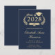 Modern budget-friendly dark navy blue college graduation announcement featuring "Class of" in a gold illustration of a laurel wreath incorporating a grad cap topper and diploma and the graduate's name in an elegant light gold script. Add their school, major, honours or future plans.