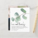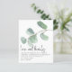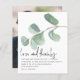 Script Eucalptus Newlywed Photo Thank You A budget friendly SMALLER 4.5” x 5.6” alternative. Available in a SEMI GLOSS 110 lb CARD STOCK or a SATIN FINISH 80 lb THINNER PAPER STOCK. Envelopes are an optional extra. Love and thanks is in a set informal handwritten style with the details beneath. Artsy watercolor green eucalyptus leaves flow down from the top right. Easily personalise the rest of the text to your own details and replace the sample photo on the back with your own.