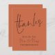 Budget Script New Mr Mrs Wedding Terracotta Thanks. A budget price SMALLER 4.5” x 5.6” alternative. Available in a SEMI GLOSS 110 lb CARD STOCK which is the default option (recommended for invitations), OR a SATIN FINISH 80 lb THINNER PAPER STOCK (ideal for enclosures). Envelopes are an optional extra and are slightly larger than the card size. Thanks and Mr & Mrs are set in a stylish handwritten script on the front and the rest of the text on each side you can easily personalise with your names, and your thank you message for your guests. Can be changed to any colour of your choice via the customise further option.