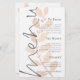 A budget price size 5.5” x 8.5”, on an elegant 110 lb LINEN stock – for a luxury feel at great value, this is perfect for menus, as well as invitations and programs etc. This budget size alternative is also available in other paper choices. The SEMI-GLOSS 110 lb card stock is about the same thickness as a postcard, so also works well for invitations. The FELT 100 lbs paper is buff coloured, NOT white, so adds a rustic touch. The MATTE 80lbs paper stock is bright white, for crisp printing, great for your menus and programs, whilst the SATIN 80lbs paper is thin and light, ideal for enclosures. PLEASE NOTE THE OPTIONAL ENVELOPES ARE A LITTLE BIGGER IN SIZE AT 6.75” x 9” approx. This modern design has Menu in elegant set grey script running up the left hand side and the rest of the text is aligned to the right which you can easily personalise as well as your names and wedding date on the back. Artsy watercolor leaves in peach are tinted in the background on both sides.