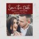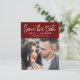 Budget Modern and Elegant Handwritten Script Square Photo Save the Date Wedding Card. The save the date invitation card includes a chic and stylish typography with a simple and minimalist design on a Burgundy background that you can add your customised engagement photograph picture to.