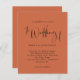 Script Terracotta Wedding Invitation A budget price SMALLER 4.5” x 5.6” alternative. Available in a SEMI-GLOSS 110 lb CARD STOCK which is the default option (thicker for invitations), OR a SATIN FINISH 80 lb THINNER PAPER STOCK (ideal for enclosures). Envelopes are an optional extra and are slightly larger than the card size. This elegant design has a stylish set typography in black for the heading the Wedding Of on a terracotta background. The rest of the text you can easily personalise.