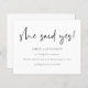 Budget Script She Said Yes Engagement Announcement. A budget price SMALLER 4.5” x 5.6” alternative. Available in a SEMI-GLOSS 110 lb CARD STOCK which is the default option (thicker for invitations), OR a SATIN FINISH 80 lb THINNER PAPER STOCK (ideal for enclosures). Minimalist elegance with She Said Yes in a modern set script.The rest of the text you can easily personalise.Shown here in black on white however the text and background colours can be changed if you wish via the customise further option.