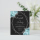 This elegant modern wedding invitation features a silver geometric frame decorated with aqua and silver flowers on a black background. The customizable text combines silver gray whimsical handwriting, copperplate and italic fonts. The reverse side is solid black.