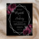 This elegant modern wedding invitation features a silver geometric frame decorated with burgundy and silver flowers on a black background. The customisable text combines silver grey whimsical handwriting, copperplate and italic fonts. The reverse side is solid black.