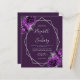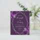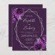 This elegant modern wedding invitation features a silver geometric frame decorated with purple and silver flowers on a plum purple background. The customisable text combines silver grey whimsical handwriting, copperplate and italic fonts. The reverse side is solid purple.