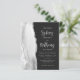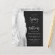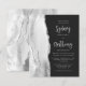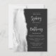The left-hand edge of this elegant modern wedding invitation features a grey and white watercolor agate border trimmed with faux silver glitter. The customisable text combines pale silver grey calligraphy script and sans serif font on an off-black background. The reverse side features a matching grey, white and silver agate design.