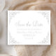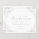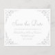 This elegant vintage-inspired formal wedding save the date card features the text in silver grey script and serif fonts, framed by a delicate vintage silver vine motif. The frame is repeated on the reverse.