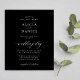 Elegant simple minimal moody dark budget affordable black wedding invitation template featuring a classy stylish chic trendy calligraphy script. ++++++++++++++++++++ Easy to personalise with your details! The invitation is suitable for formal black tie weddings. +++++++++++++++ NOTE that the background colour can be changed to match your wedding colour scheme. If comfortable doing it, you can change it after selecting CUSTOMIZE IT option. ++++++++++ PLEASE READ THIS BEFORE PURCHASING! This is a budget affordable wedding card printed on a paper sheet (each sheet has one card). ++++ For the best rapport price-quality, our advice is to choose the Semi-Gloss paper type (it is thick enough to be used for stationery) ++++ If you need envelopes, choose the ENVELOPE OPTION. +++ Double-check all the information and spelling of your text because you will receive exactly what you see - no one else will check anything before printing. ++++ This card is designed for size 4.5" x 5.6". In the case you choose another size of the card and text goes outside page, everything needs to be fixed before adding the product to cart. Please ask Live Design Service for help.