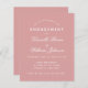 A simple engagement party invitation with a modern colour: dusty rose. It has only white text on dusty blue background. The names are written in an elegant calligraphic script, the rest in caps. the first line is arched text.