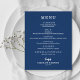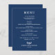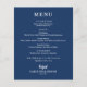 A small affordable, value paper navy blue dinner menu card with your food choices in chic white lettering is perfect for a modern wedding reception, wedding rehearsal dinner, anniversary party, or any special event with a sit-down dinner. *Measures 4.5" x 5.6" (or choose from 2 other sizes) printed on 110 lb. weight paper. Envelopes are available at an additional charge. The Live Design Service can help you with your design layout, size or adjust the colors if needed.