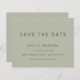 Simple Text Soft Sage Green Save The Date. A budget price SMALLER 4.5” x 5.6” alternative. Available in a SEMI-GLOSS 110 lb CARD STOCK which is the default option (thicker for invitations), OR a SATIN FINISH 80 lb THINNER PAPER STOCK (ideal for enclosures). Envelopes are an optional extra and are slightly larger than the card size. Simple elegance with Save The Date in a modern set script.The rest of the text you can easily personalise.Shown here in black on soft pale sage green however the text and background colours can be changed if you wish via the customise further option.