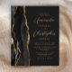 The left-hand edge of this elegant modern wedding invitation features a black watercolor agate border trimmed with faux gold glitter. The customisable text combines elegant gold-coloured script and sans serif fonts on a slate black background. The reverse side features a matching black and gold agate design.