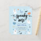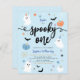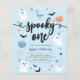 Budget spooky one cute baby blue ghost Halloween 1st birthday party invitation. Modern Halloween-themed design for a spooky party! This birthday invitation features spider's webs, ghosts, pumpkins, bats, spiders, leaves, corns, stars and daisies. This invite is great for little boys!