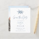 This modern minimal beach themed budget wedding save the date card has a white background with dusty blue text, two starfish at the top, and trendy handwriting script calligraphy, with a photo template on the back.