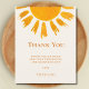 This budget baby shower thank you postcard is decorated with a yellow watercolor sun and simple typography on a soft cream background.
