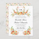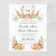 Design feature hand-painted watercolor florals in warm sunset hues of orange, red, and soft greens. A vibrant blossoms floral crest with monogram. The typography used is a elegant calligraphy script with traditional serif fonts. The back of the invitation continues the nature-inspired theme with a delicate floral pattern.