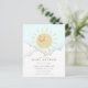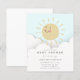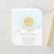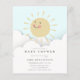 Neutral baby shower theme featuring illustration of a sunshine with smiling face over a blue sky with clouds at bottom and grey text.