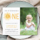 Invite family and friends to your girl's first birthday party with this cute budget 1st Birthday Invitation. It is decorated with a yellow watercolor smiling sun and says "Our Little Sunshine Is One". Easily customisable with your photo and details. Original Watercolor © Michele Davies.