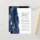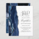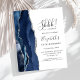 The left-hand edge of this elegant surprise birthday party invitation features a navy blue watercolor agate border trimmed with faux silver glitter. The customisable text combines handwriting, copperplate and italic fonts in charcoal grey on a white background. The reverse side features a matching navy blue and silver agate design.