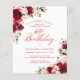 Red roses and blush pink peonies are nestled in dark green leaves on this beautiful and unique birthday invitation.