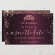 A girly and trendy Save the Date card for a Sweet 16, 16th birthday party. A burgundy faux metallic looking background colour. Decorated with rose gold faux glitter dust and a tiara, crown. The text: Save the Date is written with a large trendy hand lettered style script.