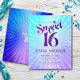 “Happy Sweet 16 Birthday”. Send out this cool boho retro, personalised budget party invitation for an event to remember. Fun, trendy, bold purple and navy blue typography with modern sans serif typography overlay a background of pop light turquoise and purple ombre gradient rays with white dots. On the back, a white sweet 16 graphic overlays a darker blue and purple pop background. Personalise the custom text with your daughter’s name as well as other party details. Guaranteed to add stylish fun to her special milestone birthday celebration! Matching plates, napkins and other birthday goodies are also available in this trendy and special collection.
