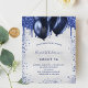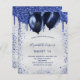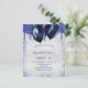 A girly and feminine birthday party invitation. On front: A faux silver background. Decorated with navy blue faux glitter drips, paint dripping look and balloons. Personalise and add a name and party details. The name is written with a hand lettered style script.