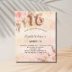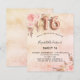 A rose gold, blush pink rustic faux metallic looking background. Decorated with rose gold and pink florals, roses, pampas grass. Personalise and add a name and party details. Number 16 is written with a balloon style font.