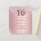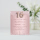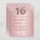A modern, stylish and glamourous invitation for a girl's Sweet 16, 16th birthday party. A dusty rose, pink faux metallic looking background with an elegant faux glitter drip, paint drip look. The name is written with a modern dark rose gold coloured hand lettered style script. Personalise and add your party details. Number 16 is written with a balloon style font, script.