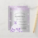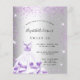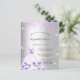 A modern, stylish and glamourous invitation for a Sweet 16, 16th birthday party. A faux silver metallic looking background with purple faux glitter dust and a dress. The name is written with a modern hand lettered style script. Personalise and add your party details.