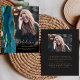 This trendy 2025 graduation announcement features a watercolor agate geode border in shades of teal blue with faux gold glitter highlights. The graduate's first name appears as an elegant gold-coloured handwriting script overlay on a vertical photo, along with the last name, school and class year in copperplate font. A black gradient filter helps the text pop. A second, horizontal photo appears on the back, along with the announcement and details in gold-coloured text on a dark off-black background.