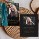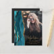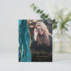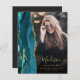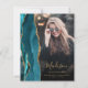 This trendy 2025 graduation announcement features a watercolor agate geode border in shades of teal blue with faux gold glitter highlights. The graduate's first name appears as an elegant gold-coloured handwriting script overlay on a vertical photo, along with the last name, school and class year in copperplate font. A black gradient filter helps the text pop. A second, horizontal photo appears on the back, along with the announcement and details in gold-coloured text on a dark off-black background.