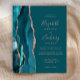 The left-hand edge of this elegant modern wedding invitation features a teal watercolor agate border trimmed with faux rose gold glitter. The customizable text combines rose pink handwriting, copperplate and italic fonts on a teal blue background. The reverse side features a matching teal and rose gold agate design.