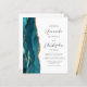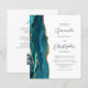 The left-hand edge of this elegant modern wedding invitation features a teal blue watercolor agate border trimmed with faux gold glitter. The customisable text combines charcoal grey script and sans serif fonts on a white background. The reverse side provides space for wedding details on a solid white background, along with a QR code guests can scan to visit your website and RSVP, which saves the cost of printing and mailing separate RSVP cards.