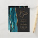 The left-hand edge of this elegant modern wedding save the date card features a teal blue watercolor agate border trimmed with faux gold glitter. The customisable text combines gold-coloured script and sans serif fonts on a slate black background. The reverse side features a matching teal and gold agate design.