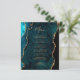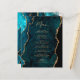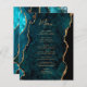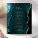 This elegant modern wedding menu features a teal blue watercolor agate border trimmed with faux gold glitter. The customisable text combines gold-coloured handwriting script and copperplate fonts. The reverse side features a matching teal and gold agate design.