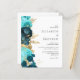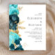 This romantic floral wedding invitation features a border of dark and light teal blue flowers set off with gold faux foil foliage. The names of the couple appear in classic charcoal grey serif font, with the remaining text in italics.