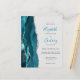 The left-hand edge of this elegant modern wedding invitation features a teal blue watercolor agate border trimmed with faux silver glitter. The customisable text combines teal handwriting script with charcoal grey copperplate and italic fonts on a pale grey background. The reverse side provides space for wedding details, along with a QR code guests can scan to visit your website and RSVP, which saves the cost of printing and mailing separate RSVP cards.