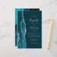 The left-hand edge of this elegant modern wedding invitation features a teal blue watercolor agate border trimmed with faux silver glitter. The customisable text combines handwriting, copperplate and italic fonts in silver grey on a dark teal background. The teal and silver agate design is repeated on the back of the card.