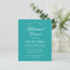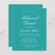 A simple rehearsal dinner invitation with a modern colour: teal. It has just white text on teal blue background. The words "Rehearsal Dinner" and the name are written in an elegant calligraphic script.