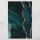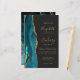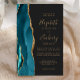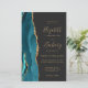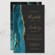 The left-hand edge of this elegant modern wedding invitation features a teal watercolor agate border trimmed with faux gold glitter. The customisable text combines gold coloured handwriting, copperplate and italic fonts on an off-black background. The reverse side features a matching teal and gold agate design.