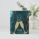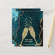Two golden champagne glasses clink together in a toast celebrating both the New Year and your move to a new home. On front of our budget card announcement is a dramatic teal and gold agate geode background with the text "New Year New Home" and "The Johnsons have moved." Both of these text blocks and all text on back of the card can be easily revised on the Personalise This template.