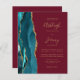 Save the cost of printing and mailing separate RSVP cards with this elegant modern all-in-one budget wedding invitation. The left-hand edge features a teal blue watercolor agate border trimmed with gold faux glitter. The customisable text combines gold-coloured handwriting, copperplate and italic fonts on a burgundy red background. The reverse side provides space for wedding details on a solid burgundy background, along with a QR code guests can scan to visit your website and RSVP.