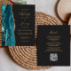 Save the cost of printing and mailing separate RSVP cards with this elegant modern all-in-one budget wedding invitation. The left-hand edge features a teal blue watercolor agate border trimmed with gold faux glitter. The customisable text combines gold-coloured handwriting, copperplate and italic fonts on a slate black background. The reverse side provides space for wedding details on a solid slate black background, along with a QR code guests can scan to visit your website and RSVP.