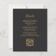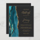 Save the cost of printing and mailing separate RSVP cards with this elegant modern all-in-one budget wedding invitation. The left-hand edge features a teal blue watercolor agate border trimmed with gold faux glitter. The customisable text combines gold-coloured handwriting, copperplate and italic fonts on a slate black background. The reverse side provides space for wedding details on a solid slate black background, along with a QR code guests can scan to visit your website and RSVP.
