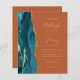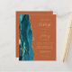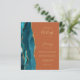 Save the cost of printing and mailing separate RSVP cards with this elegant modern all-in-one budget wedding invitation. The left-hand edge features a teal blue watercolor agate border trimmed with gold faux glitter. The customisable text combines gold-coloured handwriting, copperplate and italic fonts on a burnt orange or rust background. The reverse side provides space for wedding details on a solid burnt orange background, along with a QR code guests can scan to visit your website and RSVP.