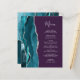 The left-hand edge of this elegant modern wedding menu features a teal blue watercolor agate border trimmed with faux silver glitter. The customisable text combines silver grey handwriting script and copperplate fonts on a purple background. The reverse side features a matching teal and silver agate design.