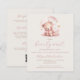 This cute baby shower invitation features a sweet watercolor teddy bear in a pink dress surrounded by gold stars, above the words "we can bearly wait" in pink handwriting script. Personalise the text with the name of the mum-to-be in pink script and the details in sans serif font on a beige background. The reverse side provides space for diaper raffle, books for baby, and registry details, along with a convenient QR code guests can scan to visit the registry. Ideal for a girl's baby shower.