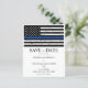 Invite your friends and family to celebrate your special day with these thin blue line police themed wedding save the date cards, accessories and gifts . These budget wedding invitation postcards need to be mailed as oversized postcards so may incur standard postage fees but they don't need an envelope or a return address label. Customise with your names, and all your wedding info. This law enforcement wedding collection will be a favourite among all police officers, police wife and law enforcement. COPYRIGHT © 2020 Judy Burrows, Black Dog Art - All Rights Reserved. Budget Thin Blue Line Law Enforcement Wedding Save The Date Postcard